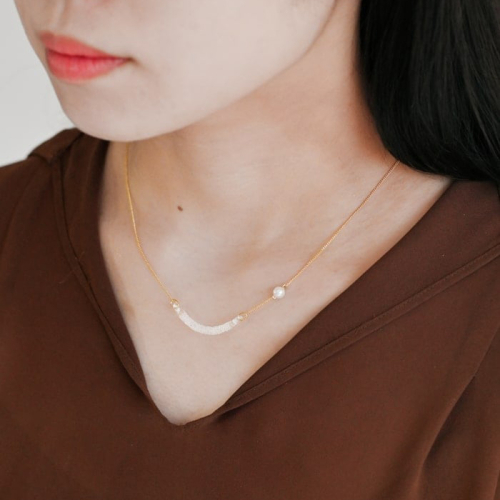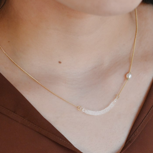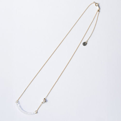 胸元に光るガラスから少し離れてパールが浮かぶ、幻想的なデザインです。