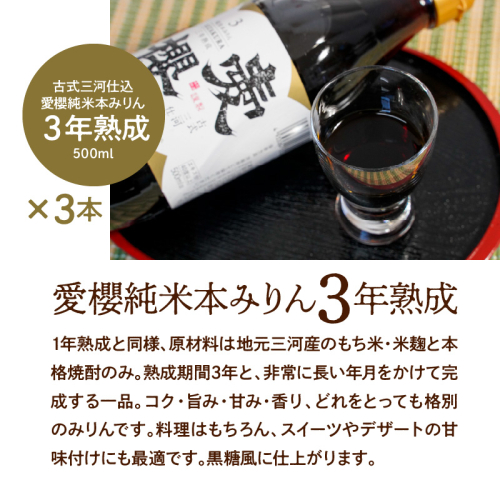 古式三河仕込 愛櫻純米本みりん 1年熟成&3年熟成 味比べセット(500ml・6本) 本醸造 国産 三河 味醂 醸造 調味料 料理 和食 米こうじ 醸造のまち 碧南市 杉浦味淋 H009-031
