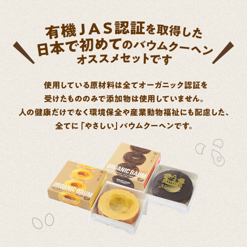 使用している原材料は全てオーガニック認証を受けたもののみで添加物は使用していません。人の健康だけでなく環境保全や産業動物福祉にも配慮した、全てに「やさしい」バウムクーヘンです。