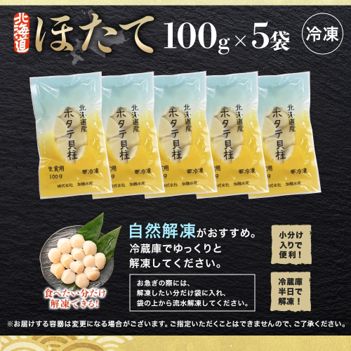 3342. ホタテ貝柱 500g 100g×5 小分け ほたて 帆立 貝柱 玉冷 貝 刺身 お刺身 海鮮 冷凍 ご家庭用 送料無料 北海道 弟子屈町