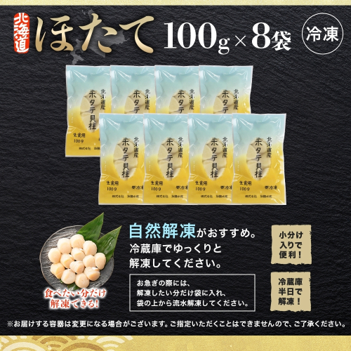 3321. ホタテ貝柱 800g 100g×8 小分け ほたて 帆立 貝柱 玉冷 貝 刺身 お刺身 海鮮 冷凍 ご家庭用 送料無料 北海道 弟子屈町