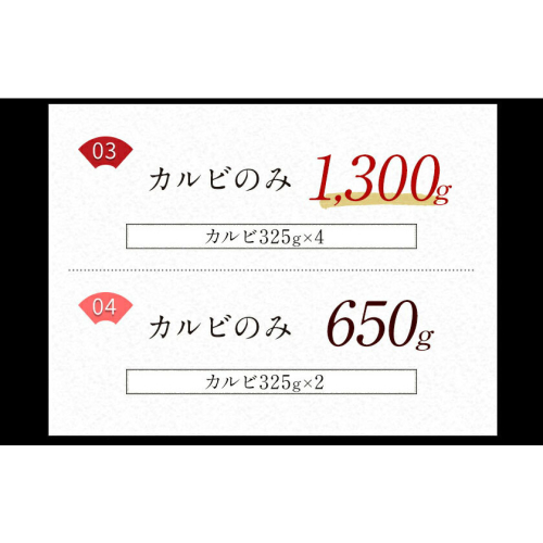 - 01.カルビ325g×2/赤身325g×2(合計約1300g)