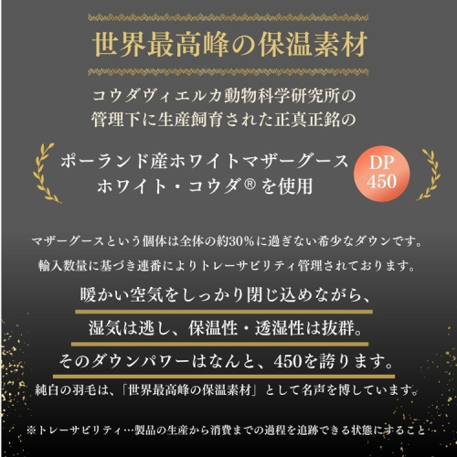 中羽毛はポーランド産のホワイトマザーグースダウン95%を使用。ポーランド国立動物飼育科学研究所が認める(ホワイト・コウダⓇ)です。ポーランドは、真冬はマイナス30度以下、夏は35度以上にもなる寒暖の激しい過酷な環境となります。コウダ種は1962年にデンマークからイタリアン・ホワイトグース種を輸入し以降半世紀にも渡って国家プロジェクトとして品種改良を続けています。120日以上の長い飼育期間により、ダウンの粒が大きく、かさ高性に優れています。そのダウンパワーはなんと450と、抜群の暖かさです。