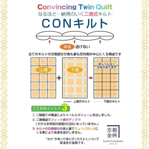 キルトは特殊2層キルト(CONキルト)を採用。二階建ての構造によりボリューム感とフィット感がアップ。キルトの交差部分が表と裏でちょうど真ん中にくることで体温を逃しません。