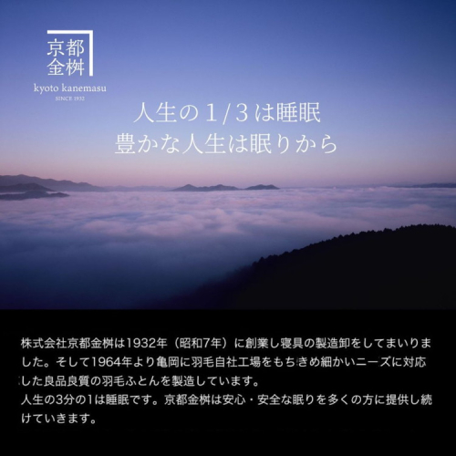 京都金桝は1932年に創業、寝具卸を始め、1964年には京都府亀岡市に羽毛工場を竣工。羽毛ふとんのパイオニアとして羽毛ふとんを作り続けてまいりました。