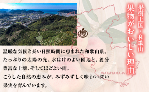 和歌山県は西日本一の桃の産地!和歌山県は果物の栽培に恵まれた環境がそろっています。それは温暖な気候、そして水はけの良い土壌。水はけが良いところで桃を栽培すると、果実は常に水分不足の状態で濃厚な味わいを生みだします。果実はふんわりやわらかくジューシーで上品な香りも特徴。夏の暑い頃、果汁したたる甘い桃をぜひお楽しみください。