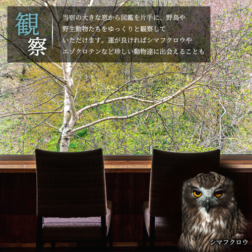 当宿の大きな窓から図鑑を片手に、野鳥や野生動物たちをゆっくりと観察していただけます。