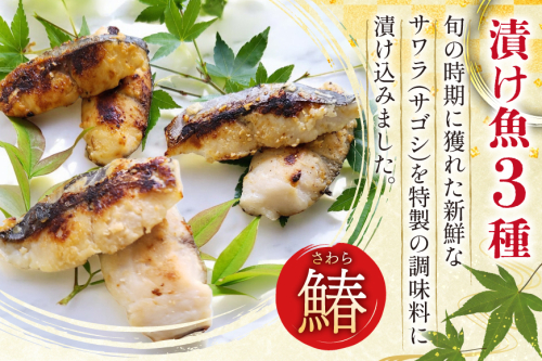 AI080 サワラの漬け3種セット 計30切 ( 西京漬け 金山寺漬け 塩麹漬け 各10切 ) さばみりん 4枚 [ 鰆 さわら サバ 鯖 魚 魚介 魚介類 切り身 切身 みりん 漬魚 個包装 小分け 丸政水産 長崎県 島原市 ]