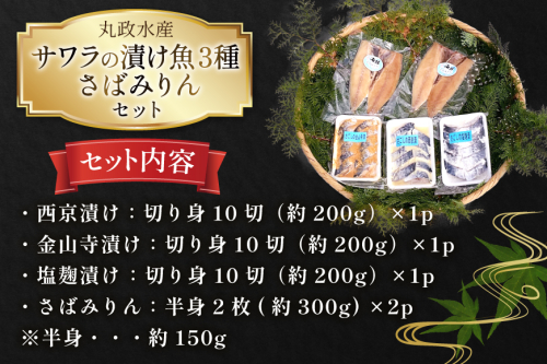 - AI080 サワラの漬け3種セット 計30切 ( 西京漬け 金山寺漬け 塩麹漬け 各10切 ) さばみりん 4枚 [ 鰆 さわら サバ 鯖 魚 魚介 魚介類 切り身 切身 みりん 漬魚 個包装 小分け 丸政水産 長崎県 島原市 ]
