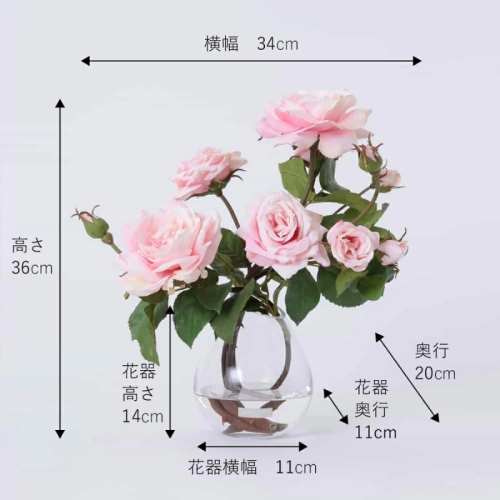 提供:株式会社 エミリオ・ロバ エミリオ・ロバのアートフラワーは最高峰の花材を使用し本物と見間違う精妙な作りです。 一般的な造花とはかけ離れたクオリティーで目にした多くの人々が生花と見間違います。 またエミリオ・ロバの魅力は高品質であること。 三重県名張市にある自社アトリエの熟練技術者たちが、手作業によって気泡を入れず水(シリコン樹脂)を注ぎ、しなやかな枝の動きや計算されたデザインを仕立てていく“名張クオリティー”として、ブランドを支えています。 庭先で咲いているガーデンローズの自然な姿をそのままに表現。 主役(プリマ)級の華やかさを纏っているという印象からエミリオ・ロバでは「プリマローズ」と名付けました。 花言葉は【愛・美】幾重にも重なる花びらのグラデーションが美しく、思わず触ってみたくなるほど瑞々しく、花びらのしわや葉脈までリアルに再現しています。 花びらだけでなく、茎や葉にいたるまで造花とは思えないほど精妙に仕上げています。 ガラスベースに水に見立てた透明な樹脂を合わせ、よりリアルに花の自然な姿を表現するスタイル、イリュージョンフラワー。 華やかさの中にも上品で落ち着いたイメージのアレンジです。 ちょっとしたギフトにもオススメです。