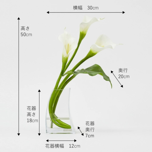 提供:株式会社 エミリオ・ロバ エミリオ・ロバのアートフラワーは最高峰の花材を使用し本物と見間違う精妙な作りです。 一般的な造花とはかけ離れたクオリティーで目にした多くの人々が生花と見間違います。 またエミリオ・ロバの魅力は高品質であること。 三重県名張市にある自社アトリエの熟練技術者たちが、手作業によって気泡を入れず水(シリコン樹脂)を注ぎ、しなやかな枝の動きや計算されたデザインを仕立てていく“名張クオリティー”として、ブランドを支えています。 カラーの自然なステムのラインを生かしたシンプルなデザインです。 すらっとしたフォルムがしなやかで美しく、思わず触れてみたくなるほど瑞々しい質感のカラー。 シャープなデザインで、シンプルでスタイリッシュな印象に。 花言葉は「乙女のしとやかさ」「清純」。 メモリアルフラワー(お供え花)、仏花にも最適です。