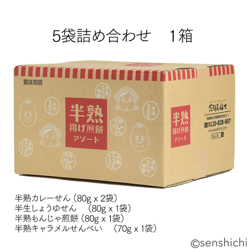 - < お中元熨斗付き >半熟せんべい 5袋詰合せ クアトロセット 半熟カレーせん 半生しょうゆせん 半熟もんじゃ煎餅 半熟キャラメルせんべい カレー味 かつおだし 甘辛ソース 新食感 もんじゃ ぬれせんべい 煎餅 煎餅屋仙七 御中元 夏ギフト ギフト [AO010sa]