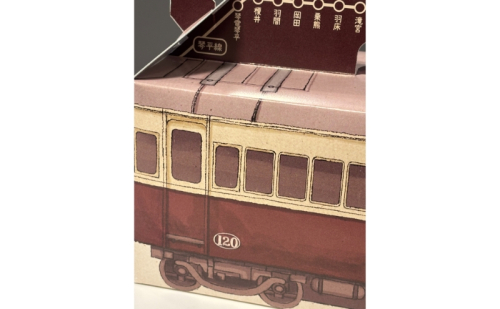 ことでんレトロ電車 1000形120号のデザインのオリジナル・コラボパッケージでパッケージには香川県の綾川町内を走る<ことでん・琴平線>の駅名が印字されています。