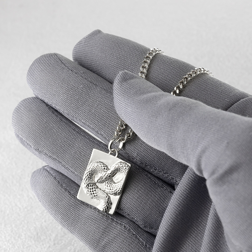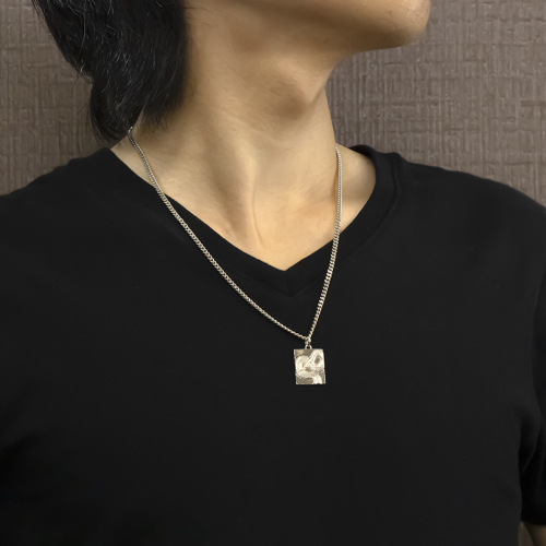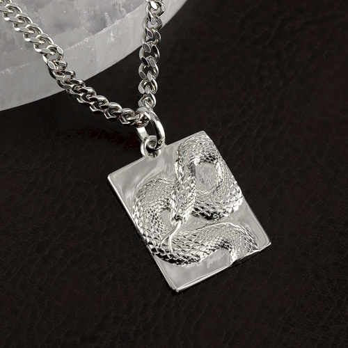 上から獲物を狙う大蛇の絵画風に仕上げられたプレートペンダント