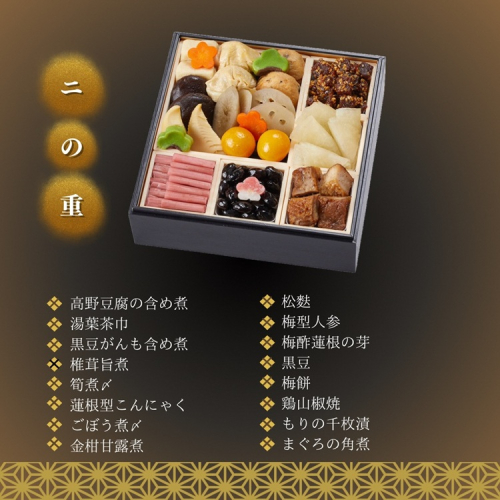 高野豆腐の含め煮:2個、湯葉茶巾:2個、黒豆がんも含め煮:2個、椎茸旨煮:2個、筍煮〆:2個、蓮根型こんにゃく:2個、ごぼう煮〆:2個、金柑甘露煮:2個、松麩:2個、梅型人参:2個、梅酢蓮根の芽:25g、黒豆:35g、梅餅:1個、鶏山椒焼:30g、京つけものもりの千枚漬:30g、まぐろの角煮:35g