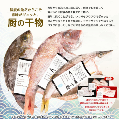 KURIYAの瞬冷コクまろ卸し晩酌セット:刺身(例:きびなご.天然)30g×2、刺身(例:かんぱち.養殖)50g、低温熟成一夜干し(例:かます.天然)×1、低温熟成干物(例:クロムツ.天然)×1※すべて季節の鮮魚を使用するため内容は変更になります。