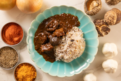 自社製造で有機JAS認証取得の「オーガニック原木干し椎茸」と、「宮崎牛」を贅沢に使った本格欧風カレーです。