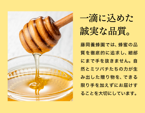 藤岡養蜂園のはちみつは、採蜜終了後に加熱をせず充填しています。そのため自然そのままの栄養や風味が詰まっています。ビタミンや酵素などの大切な成分が失われないよう、手作業で丁寧に瓶詰めしています。