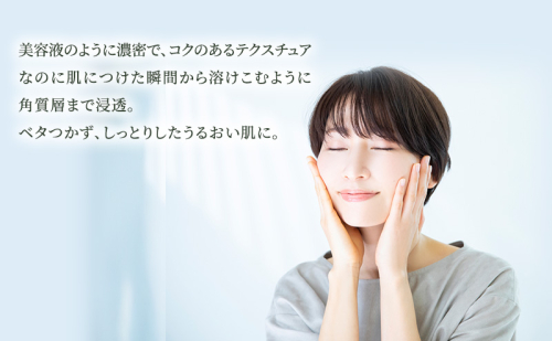 とろみのある濃密なうるおいが、すっと溶けこむように角質層まで浸透。年齢肌をリッチなうるおいで満たし、しっとりなめらかで、ハリのある肌に整えます。