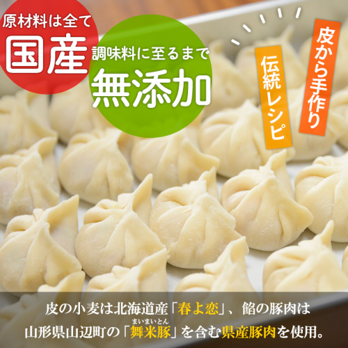 原材料は全て国産、調味料に至るまで無添加で、皮から手作り。皮の小麦は北海道産「春よ恋」、餡の豚肉は山形県山辺町の「舞米豚(まいまいとん)」を含む県産豚肉を使用。