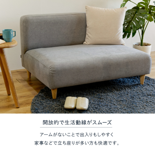 アームがないことで出入りもしやすく、家事などで立ち座りが多い方も快適です。