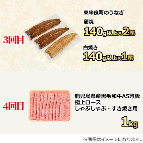 東串良町一押しの鰻とお肉の4回贅沢定期便!鹿児島県大隅産の鰻と鹿児島県の黒毛和牛を贅沢にご賞味ください。