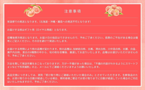※収穫時期により品種が異なります。収穫時に一番美味しい旬の桃をお送りしますので品種のご指定はできません。予めご了承ください。どんな品種が届くがお楽しみにお待ちください!