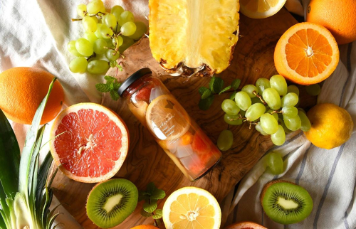 グレープフルーツ、オレンジ、パイナップル、ぶどう、キウイ、レモン、ナタデココ、漬け原材料[りんご酢、粗糖、グラニュー糖、はちみつ、赤ワイン、ラム酒、香辛料(エルダーフラワー)]