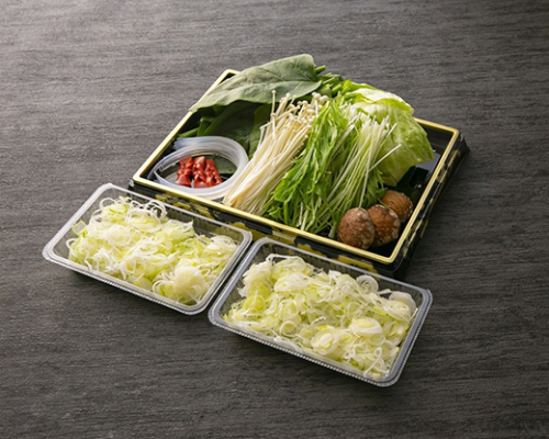 つけだれ(しょうゆ(国内製造)、本みりん、かつお節、さば節、昆布、煮干し)、野菜(ほうれん草、水菜、レタス、えのき、椎茸)、バームクーヘン豚(国産)、そば(小麦粉、そば粉、食塩)、くずきり、赤こんにゃく、柚子唐辛子(柚子皮、唐辛子、食塩)/こんにゃく用凝固剤(水酸化カルシウム)、着色料(三二酸化鉄)、(一部に小麦・そば・豚肉・大豆・さば・卵・乳成分を含む)