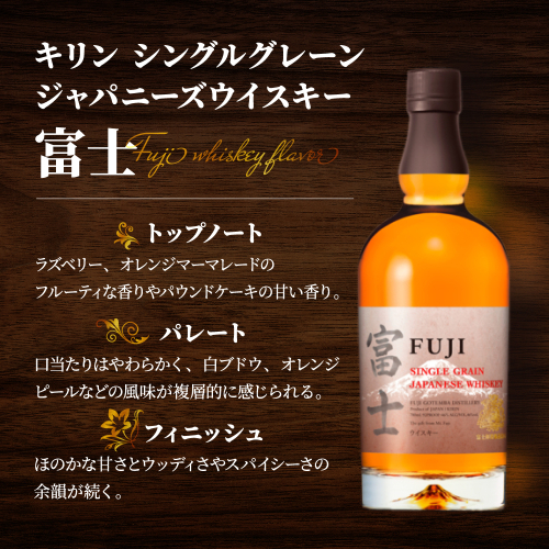 グレーンウイスキーのみを使用し、フルーティーな果実香、オレンジやグレープの香味が感じられのが特徴のシングルグレーン「富士」。