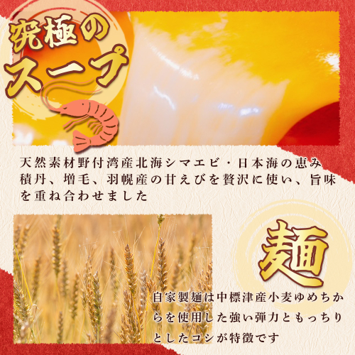 天然素材野付湾産北海シマエビ・日本海の恵み積丹(しゃこたん)、増毛(ましけ)、羽幌(はぼろ)産の甘えびを贅沢に使い、旨味を重ね合わせたこだわりのスープ。厳しい寒さと豊かな大地が育んだ北海道中標津産小麦ゆめちからを使用した、強い弾力ともっちりとしたコシが特徴の麺。