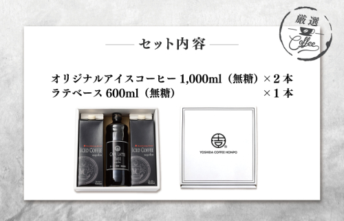 - 【お歳暮対応】ギフトセット アイスコーヒー 1,000ml(無糖)×2本 & カフェラテベース600ml(無糖)×1本 吉田珈琲本舗 短冊熨斗 099H1957o