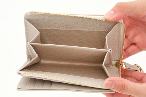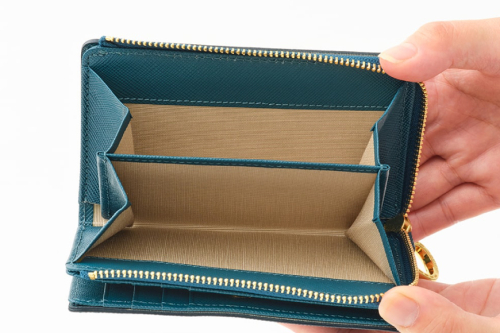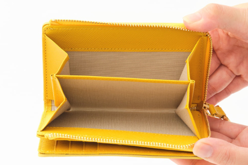 アクセスの良いL字ファスナーにマチ付きで大きく開く小銭入れ。
