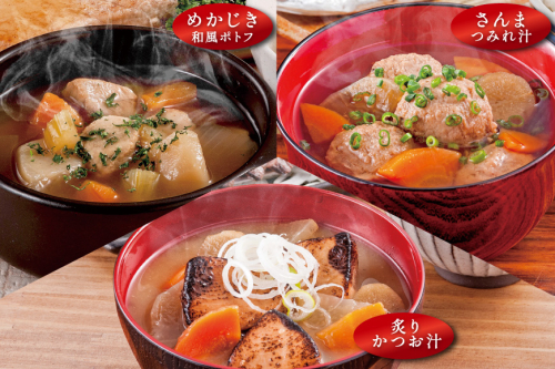 魚の素材の良さを活かした味付けの「さんま蒲焼き」「さば味噌煮」、野菜と国産の魚を組み合わせた「かつおとたけのこの柔らか煮」「いわしとごぼうの生姜煮」、魚の素材の良さを活かし優しい味に仕上げた「さんまつみれ汁」など9種類の煮魚惣菜と汁物をお楽しみいただけるセットです。