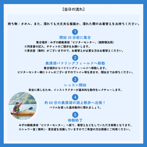 ・体験チケットには、カヤックのレンタル料、更衣室、シャワー室の無料でのご利用が含まれます。