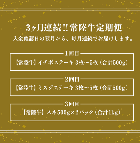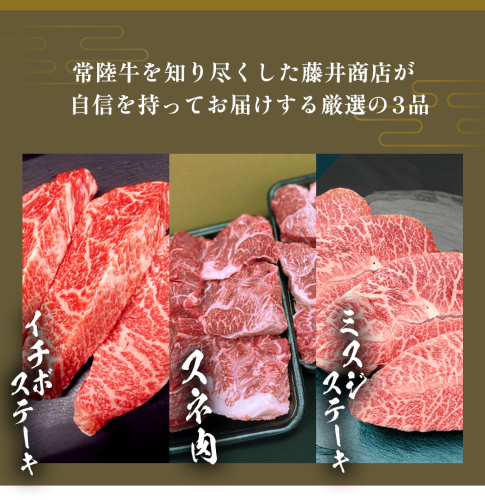 - 【 常陸牛 】 3ヶ月連続定期便!厳選部位を毎月1品お届け (茨城県共通返礼品) 希少部位 国産黒毛和牛 黒毛和牛 国産 国産牛 和牛 牛肉 お肉 お肉 肉 牛 専門店 ひたち牛 ブランド牛 A4 A5 ランク イチボ ミスジ ステーキ すね肉 ブランド 冷凍 BBQ バーベキュー 焼肉 煮込み トロトロ とろとろ 藤井商店 [CD084sa]