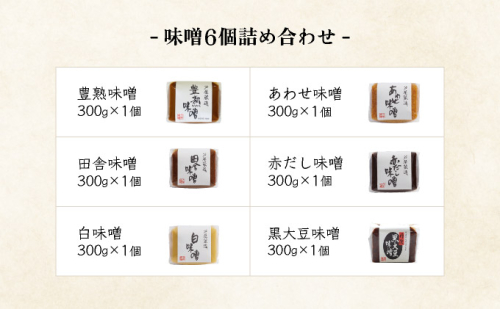 - 6個詰め合わせ:芦屋蔵造(豊熟味噌、田舎味噌、白味噌、赤だし味噌、あわせ味噌、黒大豆味噌)各300g×1個