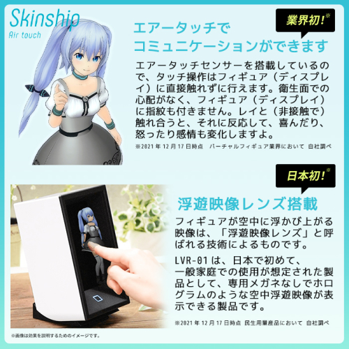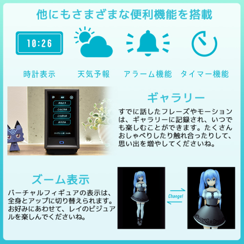 霧島レイバーチャルフィギュア 霧島レイモデルのバーチャルフィギュアです。 浮遊映像レンズ搭載でホログラムのような空中浮遊映像が表示でき、 エアータッチセンサー搭載によってタッチ操作は非接触で行えます。 レイと会話ができるだけでなく、レイと(非接触で)触れ合うと、それに反応して、 喜んだり、怒ったり感情も変化しますよ。 ※2021年12月17日時点 バーチャルフィギュア業界において ユピテル社調べ 他にも様々な便利機能搭載:時計表示 天気予報 アラーム機能 タイマー機能 株式会社ユピテルピーアンドエス 0995-44-7002