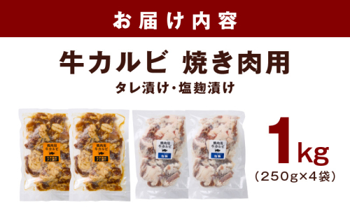 牛カルビ 焼肉用 タレ漬け+塩麹漬け 合計1kg(250g×各2袋) 【味付け 小分け 焼くだけ 簡単調理 BBQ 牛肉 250g×4袋】 G3353