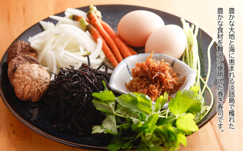 豊かな大地と海に恵まれる淡路島。その島で穫れた豊かな食材を贅沢に使用した巻き寿司です。米や海苔はもちろん、淡路牛・純国産鶏のさくら玉子・玉ねぎ・ひじき・ちりめん、淡路島の色とりどりの食材を使っています。ぜひ『淡路島をまるかぶり』してみてください。