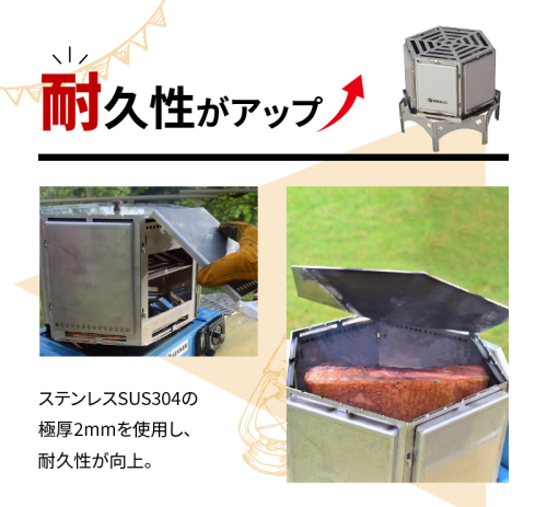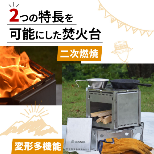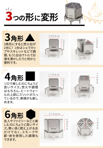 二次燃焼と変形多機能を可能にした焚火台 ステンレスSUS304の極厚2mmを使用し、耐久性がアップ 【用途に合わせて3つ形に変形可能】 ■6角形の使い方 友人やファミリーなどと楽しむのにちょうど良いサイズ。勢い良く燃え上がる炎だけでなく、スモークや薪・炭を使用した調理もできます。 ■4角形の使い方 ソロで楽しむのにちょうど良いサイズ。焚火や調理はもちろん、ヒートウォールの上部にスリットが入っているので、串焼きも楽しめます。 ■3角形の使い方 3角形にすると焚火台が2台に!1台はシェラカップやスキレットなどで調理、もう1台はケトルでお湯を沸かしたりと何かと便利です。 【地場産品基準】 3ロ(企画立案) :区域内で企画立案、収納袋へのロゴ入れを行うことにより相応の付加価値が生じているもの。