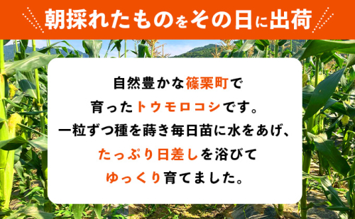 まるでフルーツのように上品な甘さと爽やかな香りが特徴の『サニーショコラ』 自然豊かな篠栗町で育ったトウモロコシです。 一粒ずつ種を蒔き毎日苗に水をあげ、たっぷり日差しを浴びてゆっくり育てました。 朝採れたとうもろこしをその日のうちに、篠栗町から出荷しています! 地元の学校給食でも使用されている、安心安全でご家族皆様に人気のトウモロコシです! 地場産品基準: 告示第5条第3号に該当 当該地方団体の区域内において返礼品等の製造、加工その他の工程のうち主要な部分を行うことにより相応の 付加価値が生じているものであるため。