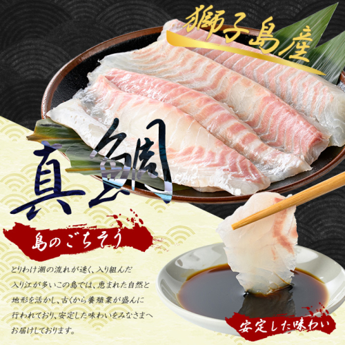 鹿児島県獅子島の漁師が五感とデータ管理に基づき丁寧に育てた自慢の養殖真鯛です。水揚げ直後の締めはもちろん、神経締め、特殊血抜きを行い、一匹づつ丁寧に捌いて仕上げました。旨味と甘みが強い獅子島産の真鯛をお刺身や鯛しゃぶとして召し上がっていただけます。雌節と雄節とそれぞれ真空パックにしてお届け致します。