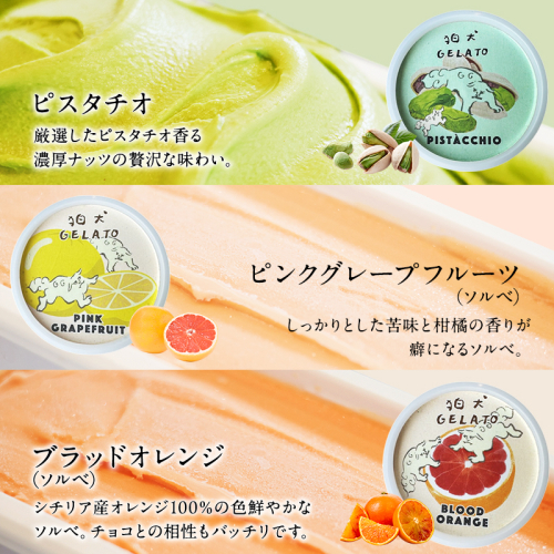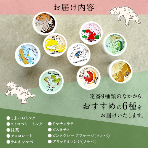 ・定番ジェラート9種類(こまいぬミルク、ストロベリーミルク、抹茶、チョコレート、ラムネミルク、ドルチェラテ、 ピスタチオ、ピンクグレープフルーツ、ブラッドオレンジ)からおすすめの6種をお届け。