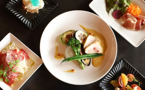 (2)淡路島ランチコース:シェフ特性の淡路島産品を使用したコース料理と、自分で作った古酒のペアリングを堪能。料理と古酒の絶妙な気見合わせをお楽しみいただけます。