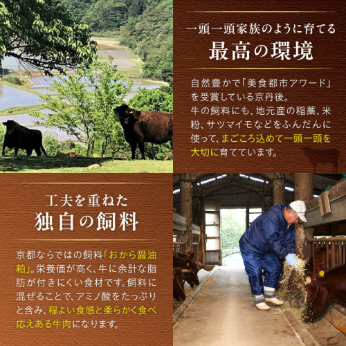 「京たんくろ和牛」は、短角牛の母、黒毛和牛の父から生まれた「京都生まれ京都育ち」の和牛です。赤身肉の旨味が濃い「短角牛」と、細やかで口溶けのよいサシが美味しい「黒毛和牛」を両親に持つため、旨味の強い赤身肉と、口溶けの良いサシの二つを兼ね備えているのが特徴です。 豊富な旨味は、旨味成分イノシン酸が通常の牛肉の12倍あることが判明し(宇都宮大学の調査による)、テレビ番組「満点★青空レストラン」で紹介されました。 牧場では、牛が健康で安心して育っていけるよう、母牛は放牧し、地元農家さんの協力のもと、飼料米や牧草、発酵醤油粕などのエコフィードを利用しています。 ※冷凍は肉の細胞を壊さないよう急速冷凍しています。解凍は、お召し上がりになられる前日に、冷蔵庫に移して「ゆっくり」解凍すると、品質の劣化がほとんどなく、美味しく召し上がって頂けます。解凍後は出来るだけその日のうちにお召し上がりください。 【地場産品類型】1 【類型該当理由】区域内で肥育されたブランド和牛であるため