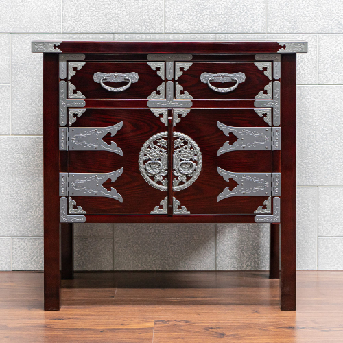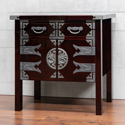 脚付のデザイン、気軽に水拭きが出来る木地呂漆調ウレタン仕上げ、そして仙台箪笥の独特な飾り金具が、リビングルームに置いてもステキな印象です。