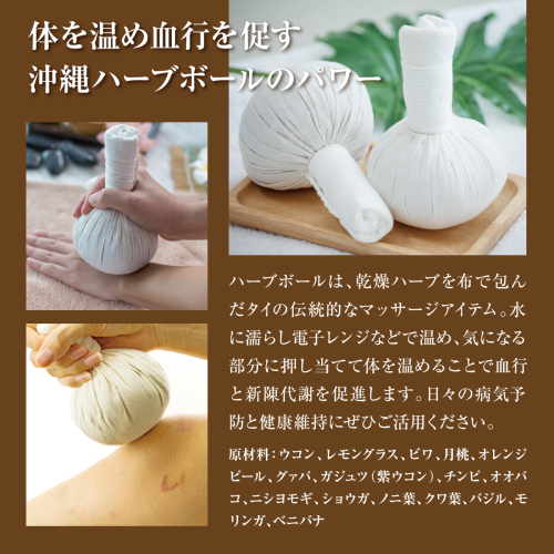 沖縄ハーブボールは体を温め、血行を良くし、新陳代謝を促進します。病気予防のためにも日頃から自らの身体を大切し、温かく血行を良くして健康維持にぜひ沖縄のハーブボールを活用していただければ幸いです。 【原材料】 「沖縄ハーブボール」ウコン、レモングラス、ビワ、月桃、オレンジピール、グァバ、ガジュツ(紫ウコン)、チンピ、オオバコ、ニシヨモギ、ショウガ、ノニ葉、クワ葉、バジル、モリンガ、ベニバナ