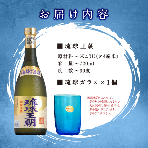 沖縄の地酒「泡盛」。沖縄の雰囲気をご自宅でも感じて頂けるよう琉球グラスを1個お付けしてお届けします。 泡盛をあまり飲みなれない方は、緑茶やブラックコーヒなどお好みに合わせて割って召し上がってください! オススメは、7:3でブラックコーヒーと泡盛で割ると美味しく頂けます!この機会に是非ご賞味ください。 琉球王朝 原材料:米こうじ(タイ産) 内容量:720ml 度数:30度 琉球ガラス×1個 ※琉球ガラスについて、手作りでの製法になるので大きさや形、色味(濃淡)に多少違いがございます。予めご了承下さい。 ※琉球ガラスの在庫状況で返礼品の発送が遅れる場合がございます。商品でき次第お送り致しますのでご理解宜しくお願い致します。 ※20歳未満の飲酒は法律で禁止されています。
