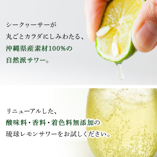 【2018沖縄南城セレクション 認定】 商品名:琉球レモンサワー 「南城セレクション」とは南城市の地域資源及び歴史・文化的にゆかりのあるものを活用して開発された商品を市が推奨品として認定 こちらの商品は沖縄県産素材を100%使用したあふれる果汁感が特徴のプレミアムサワーです。 搾り方に拘った沖縄県産シークワーサー果汁と香りがよくほのかに甘い地酒泡盛、沖縄県産サトウキビを煮詰めた深いコクと風味が特徴のきび蜜を使用しています。 酸味料・香料・着色料・人工甘味料は使用していません。 シークヮーサーとは沖縄の方言で、和名ではヒラミレモンといい、レモンと同じ柑橘類です。 無添加に拘った、贅沢でからだに優しい大人のサワーをぜひお楽しみください。 ※20歳未満の飲酒は法律で禁じられています。  20歳未満の方は酒類のお申込みはできません。 【琉球レモンサワー】における、製造過程の大部分を南城市内の南都酒造所で行っております。 【原材料名】 泡盛(沖縄県製造)、シークワーサー果汁(沖縄県産)、きび蜜(沖縄県産)/炭酸